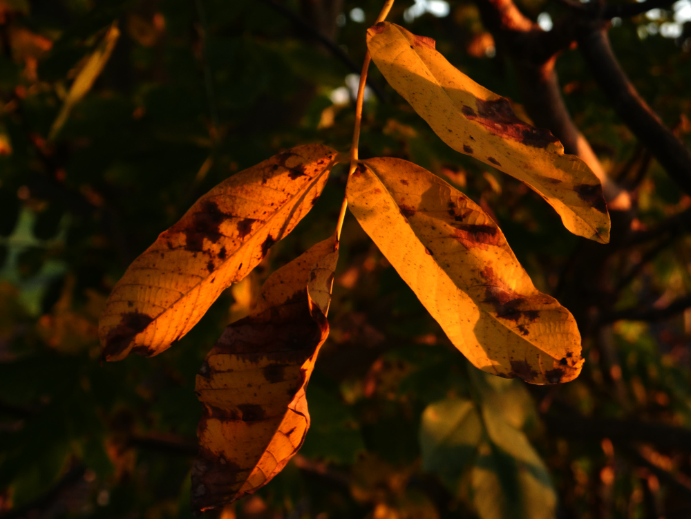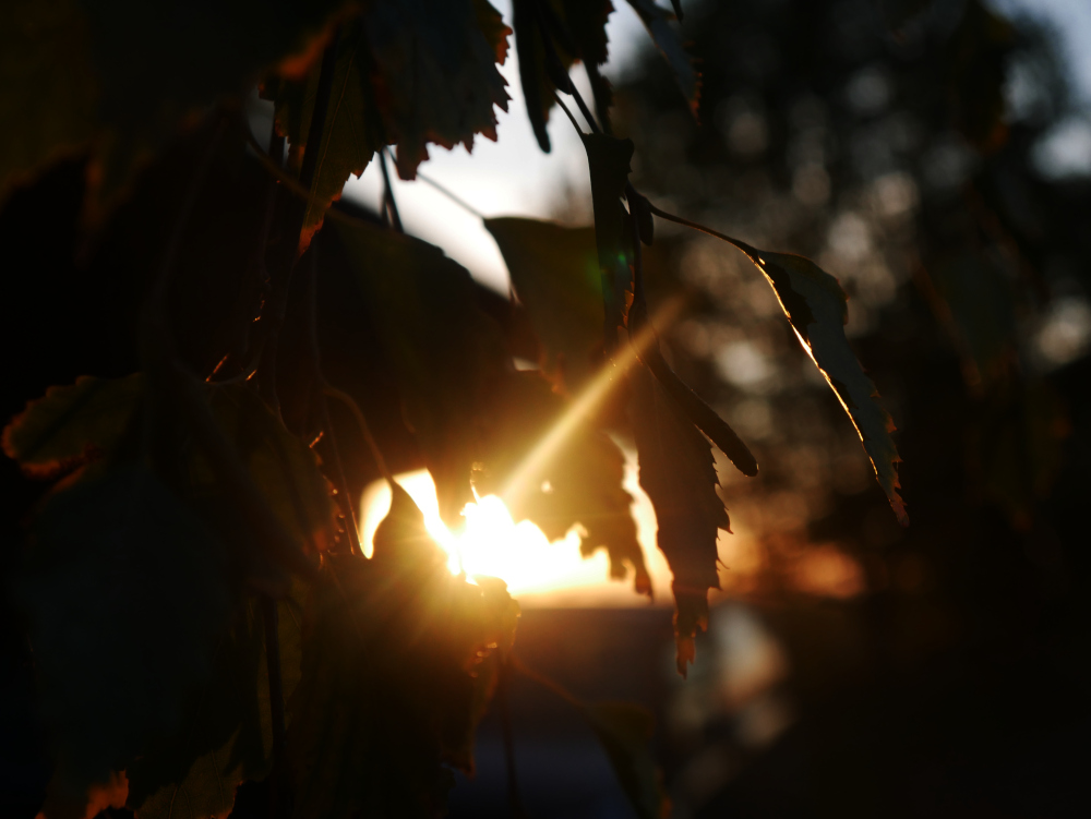 Das Foto zeigt eine Gegenlichtaufnahme durch Blätter, die Sonne ist kurz vor dem Untergang und scheint durch eine Lücke zwischen den Blättern. An den Blättern sind schon die ersten Verfärbungen erkennbar.