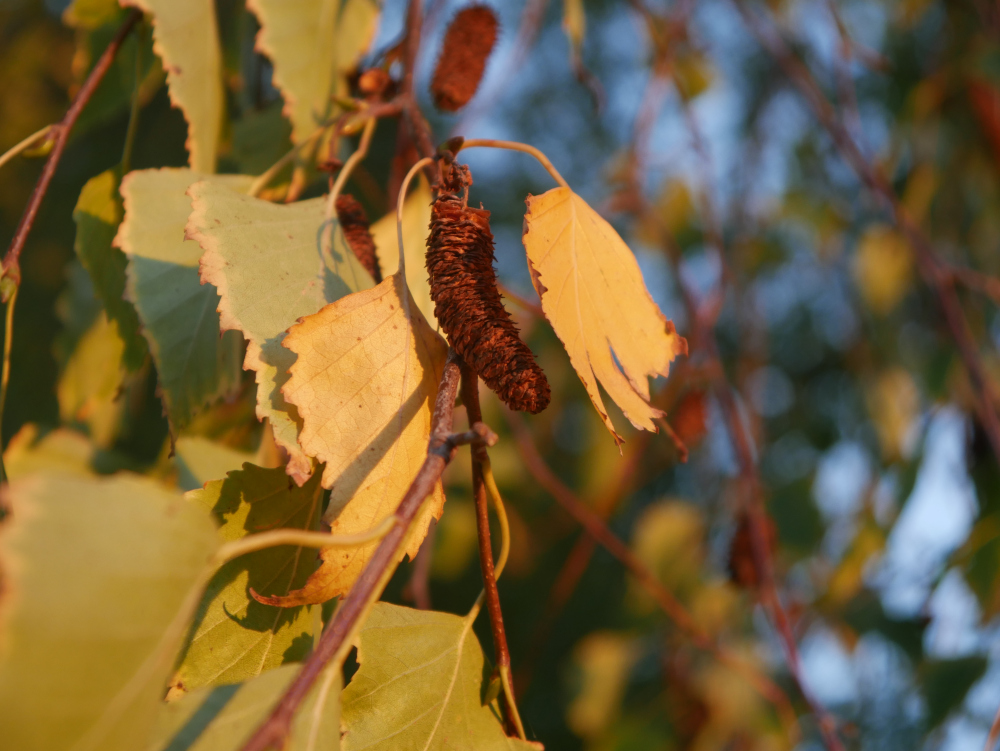 Das Foto zeigt herbstlich gelbe Blätter, die noch an einem Zweig hängen, dazwischen der Blütenstand.