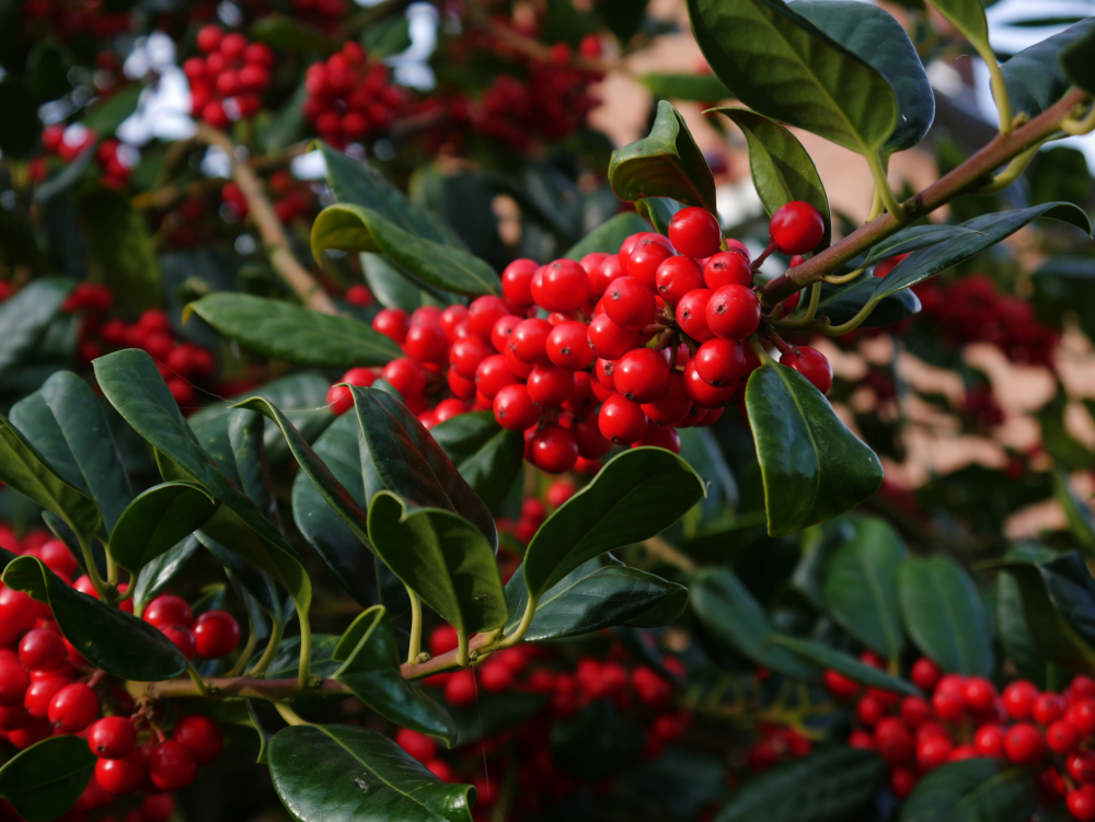 Das Foto zeigt kleine rote Beeren an Ästen mit dunkelgrünen Blättern.