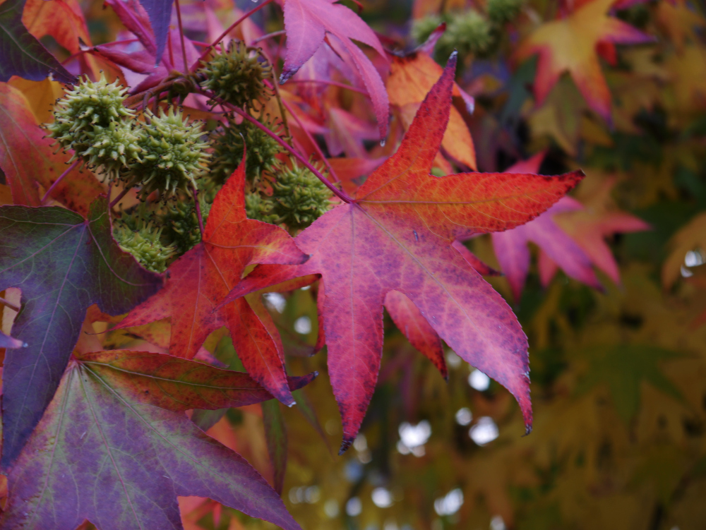 Das Foto zeigt die roten, herbstlichen Blätter eines Baums und zwischen den Blättern sind kleine, stachlige Frückte erkennbar.